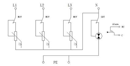 DXH06-FC621/3+1交流電源電涌保護器用于交流電源的第二級(C級)雷電過電壓保護,采用3+1防護電路,如下列圖形所示。