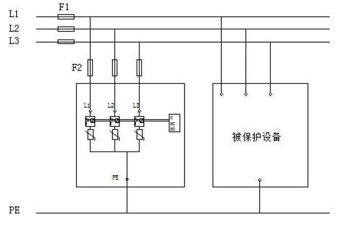 交流浪涌保護器用于交流電源的第二級(C 級)雷電過電壓保護,三相浪涌保護器采用-3防護電路,如下圖所示。