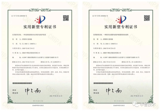 2021年4月16日,國家知識產權局分別授予了“一種易拆裝的防閃擊型雷電保護裝置(專利號:ZL202021586674.1)”、“一種防閃擊型雷電保護裝置的防松結構(專利號:ZL202021586675.6)”實用新型專利權。截止至目前,公司共有授權專利134項,其中發明專利16項,實用新型專利96項,外觀專利22項。