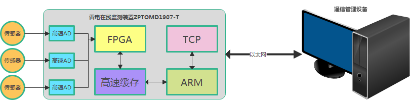 雷電在線監測裝置通過雷電流傳感器采集雷電脈沖,經過流/過壓保護后,將輸出的是幾十至幾百伏的雷電壓脈沖信號分壓、分流后送入高速A/D進行數字化處理。FPGA將實時對數字信號進行緩存并與ARM交互數據,ARM將雷電流緩存數據進行數字濾波計算,并將處理后的雷電流數據保存在內部寄存器中,同時ARM實時響應來自modbus master的modbus TCP消息,返回對應的雷擊數據。